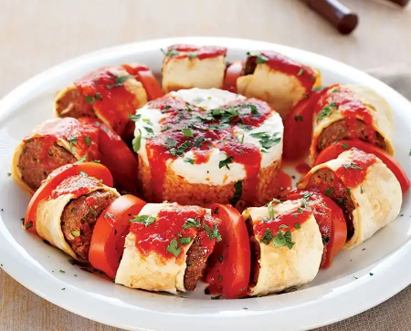 - Kıyma rulolarının ortalarına iç harcı koyup rulo şeklinde sarın.