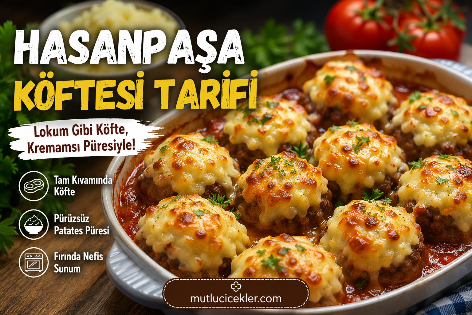 Hasanpaşa köftesi, klasik köftenin fırında patates püresiyle buluştuğu, hem göze hem damağa hitap eden özel bir Türk yemeğidir. Üzerindeki kaşar peyniri ve domates sosuyla restoran kalitesinde bir lezzet sunar.