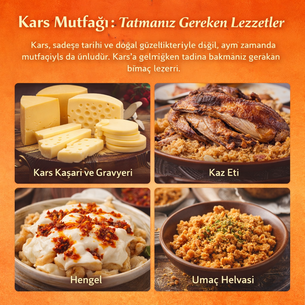 Kars, sadece tarihi ve doğal güzellikleriyle değil, aynı zamanda mutfağıyla da ünlüdür. Kars’a gelmişken tadına bakmanız gereken birkaç lezzet: