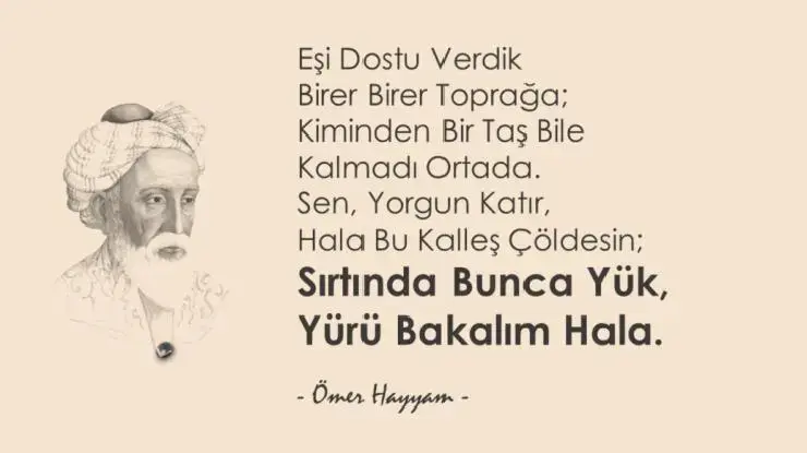 Ömer Hayyam, en çok rubaileriyle tanınır. Rubai, dört mısradan oluşan bir şiir türüdür. Hayyam’ın rubaileri, genellikle varoluş, ölüm, kader ve insanın evrendeki yeri gibi temaları işler. İşte Ömer Hayyam’ın ünlü bir rubaisi: