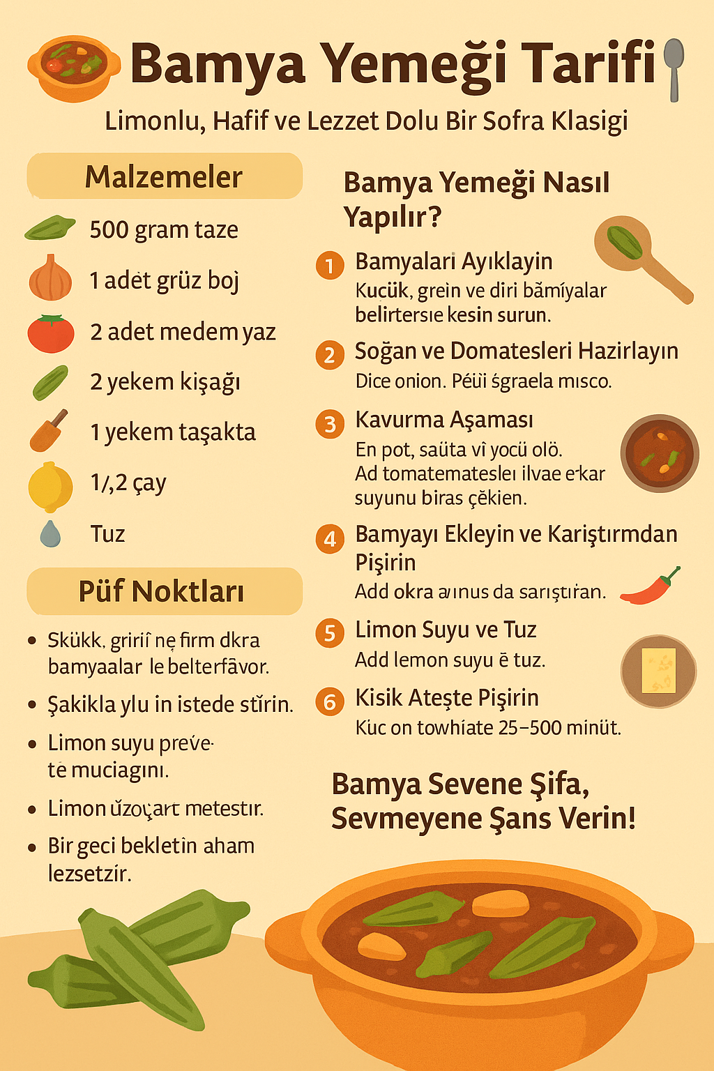 🔹 Bamya seçimi çok önemli: Küçük, yeşil ve diri bamyalar lezzet açısından daha iyidir.