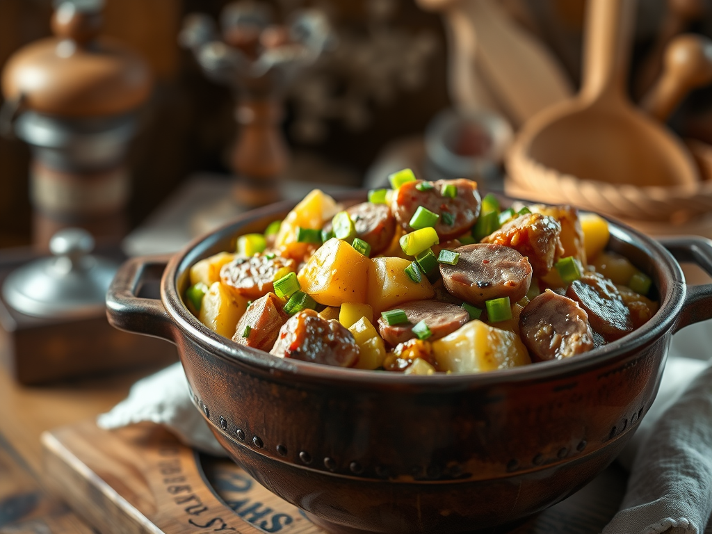Return the sausage to the pot. Pour in the chicken broth. Cover and reduce heat to low. Let it simmer gently for about 30–40 minutes, or until potatoes are fork-tender and slightly broken down, forming a creamy base. - Final touches: