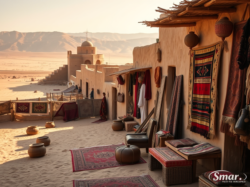 Çöl manzaralı bir sokakta geleneksel Berberi halıları, süs eşyaları ve oturma alanlarıyla dolu evler görünmektedir. Arka planda dağlar ve yapılar yer almakta.