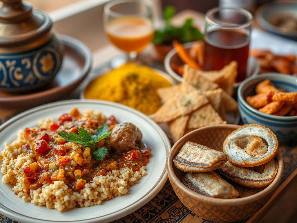 Batı Sahra mutfağından ünlü yemeklerin sunulduğu bir masa; couscous, et yemeği, çay ve çeşitli atıştırmalıklar ile süslenmiş.