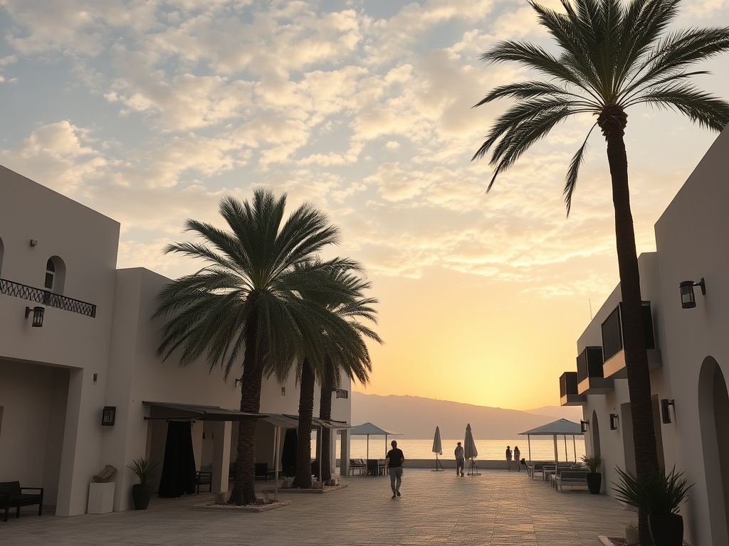 Sahilde, palmiye ağaçlarıyla çevrili bir alanda gün batımı manzarası, modern yapılar ve gökyüzünde hafif bulutlarla birlikte yumuşak ışık atmosferi.
