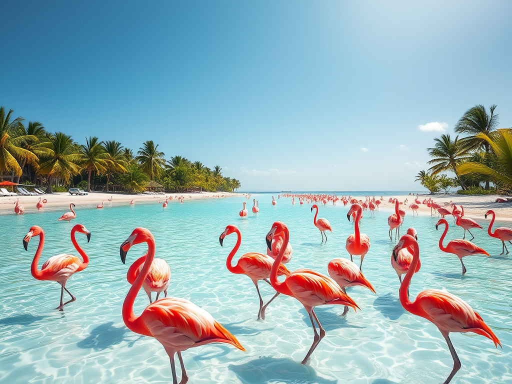 - Sahilde özgürce dolaşan flamingolarla yüzün.