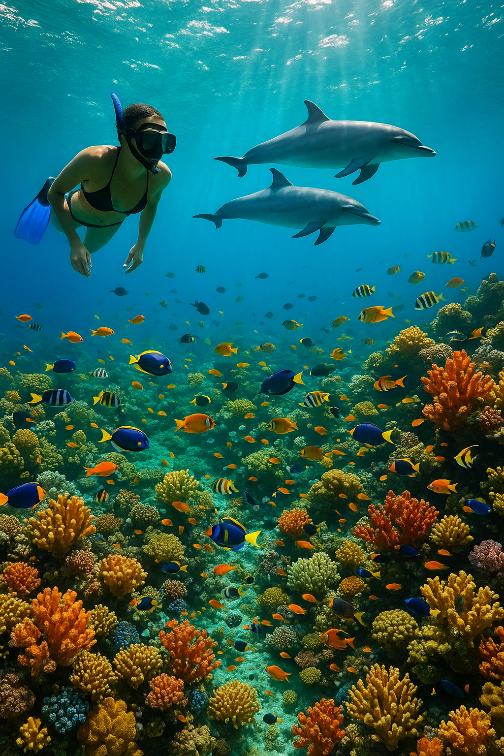 Rengarenk mercanlar, tropik balıklar ve yunuslarla yüzme şansı bulabilirsin. 🐬