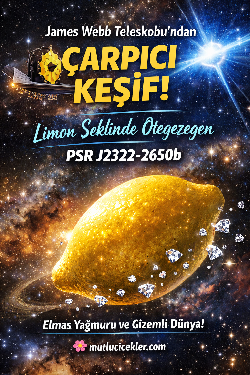 Evren her geçen gün yeni sürprizlerle karşımıza çıkıyor! NASA’nın James Webb Uzay Teleskobu (JWST), daha önce hiç görülmemiş bir ötegezegeni gözlemleyerek astronomi tarihine yenilikçi bir pencere açtı. Bu gökcismi PSR J2322-2650b, sıradan bir gezegen olmaktan çok daha öte: şekli limona benziyor ve atmosferi bilim insanlarını şaşkına çeviriyor.