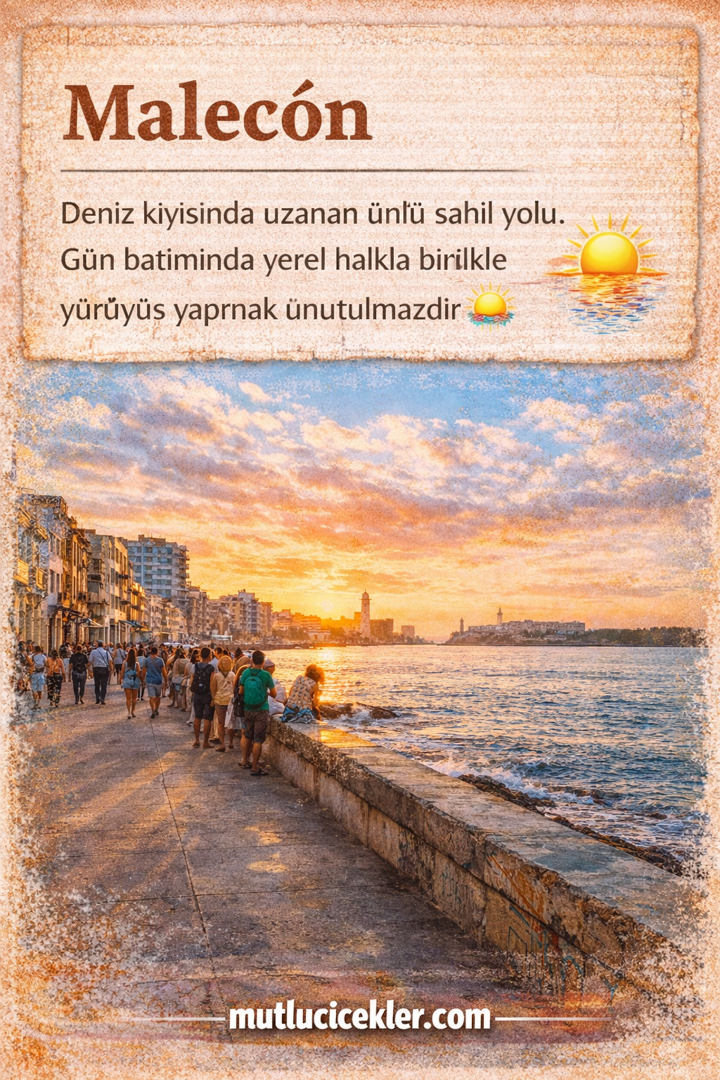 Deniz kıyısında uzanan ünlü sahil yolu. Gün batımında yerel halkla birlikte yürüyüş yapmak unutulmazdır 🌅