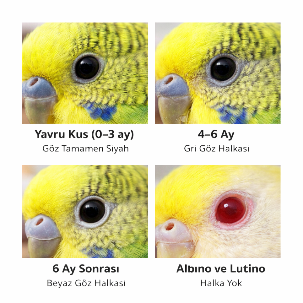 Muhabbet kuşlarının göz yapısı yaşa göre değişir.